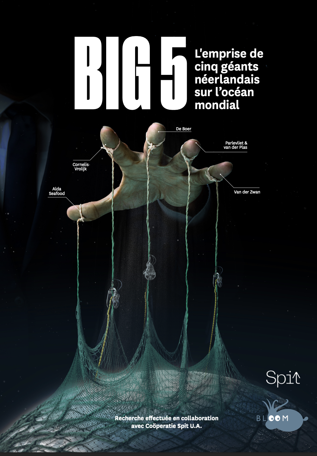 La première enquête, réalisée avec le consortium de journalistes d’investigation néerlandais Spit, reconstruit pour la toute première fois l’empire tentaculaire et opaque de cinq groupes industriels néerlandais, les « Big Five », qui sous des apparences de concurrence ont en réalité partie liée par des intérêts financiers communs au sein de plus de 400 filières. Les Big Five possèdent 230 navires, pratiquant tous, sauf un, les pêches les plus destructrices : chalutage pélagique, chalutage de fond et senne démersale. Ces Big Five, les entreprises Parlevliet & Van der Plas (P&P), Cornelis Vrolijk, Van der Zwan, Alda Seafood et la famille De Boer, forment un oligopole extrêmement puissant qui domine la pêche européenne, capte les quotas de pêche au détriment des pêcheurs artisans et pose de graves problèmes au bon fonctionnement des démocraties par le contrôle qu’il exerce sur les décisions publiques. En France, les Big Five ont stratégiquement investi en Bretagne et à Boulogne-sur-Mer par le biais de leurs filiales françaises. Avec 24 navires, ils contrôlent une partie importante des quotas de pêche français.