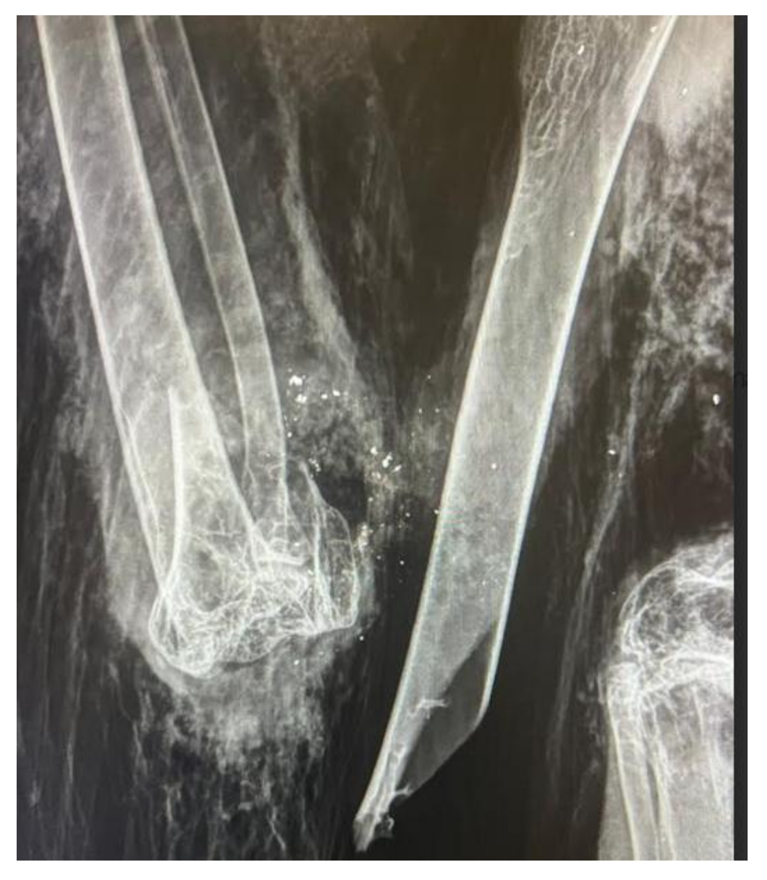 Radiographie d’admission : fracture ouverte de l’humérus droit associée à la présence de fragments métalliques dans le foyer de fracture.